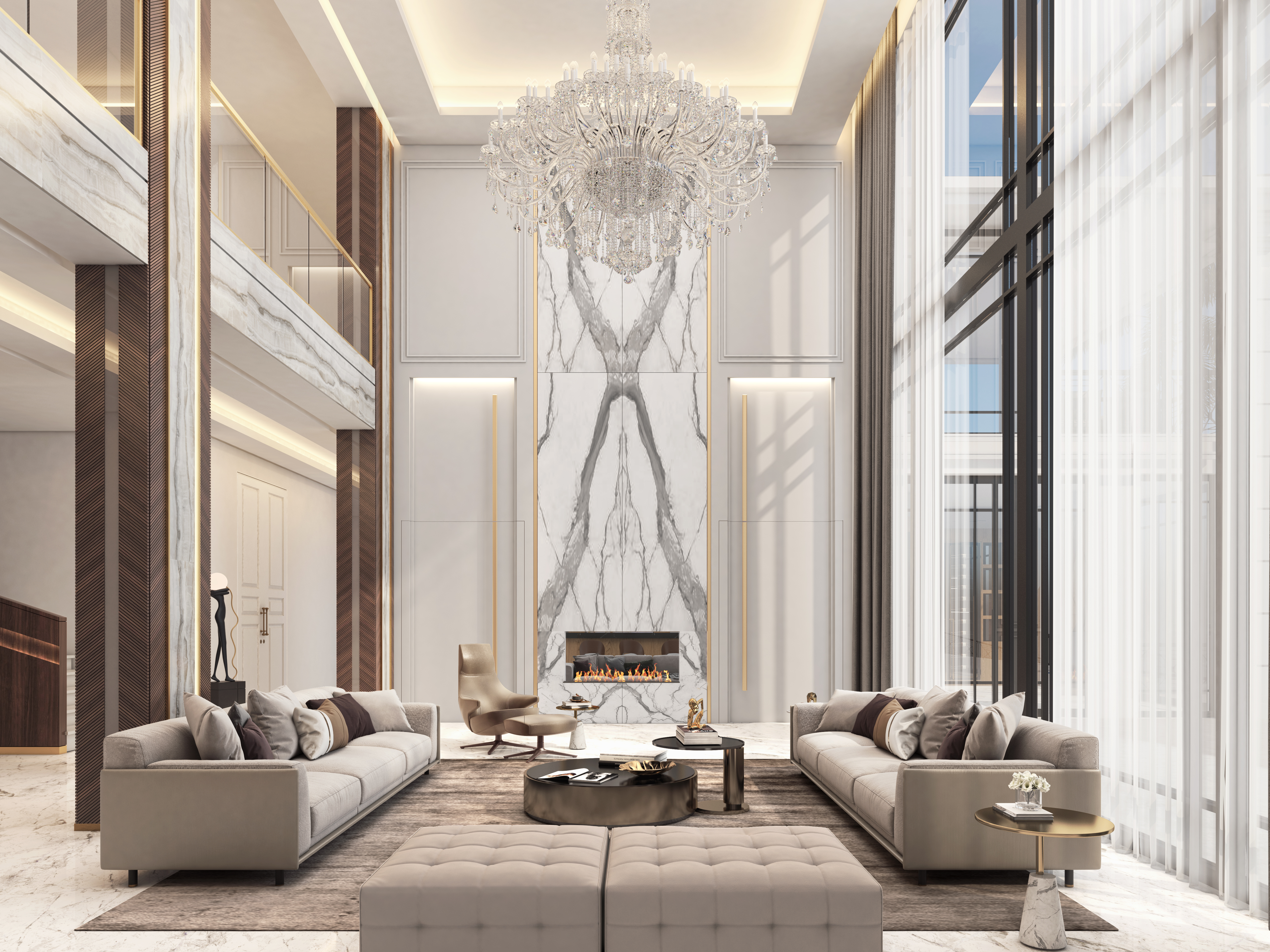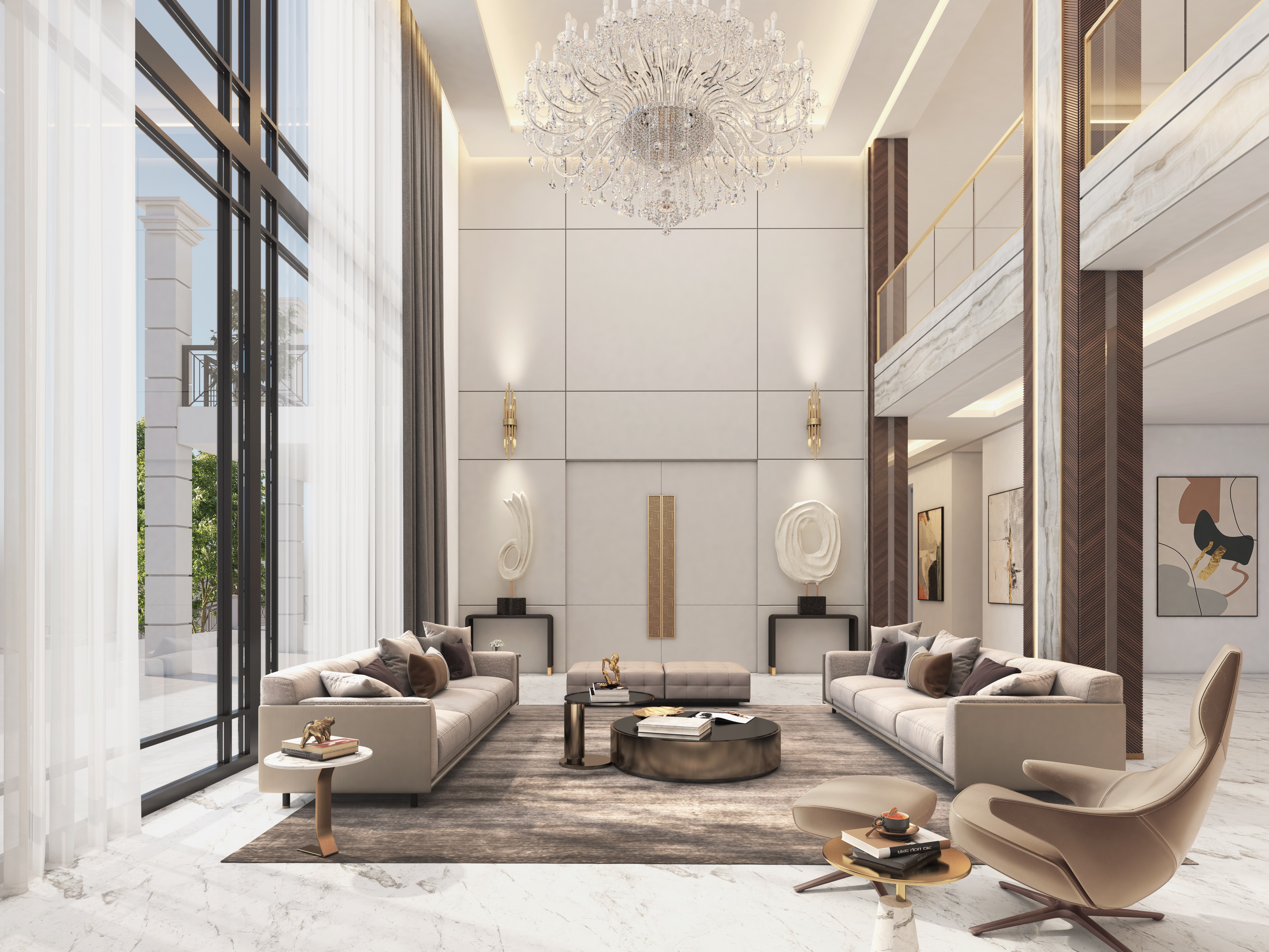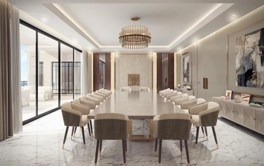 Rita Chraini unveils a full-scale renovation of a 7,000 sq ft penthouse at Artes Surfside, Miami—a residence where refined French sophistication is seamlessly blended with the serenity of oceanfront living. At the heart of the design lies a dramatic onyx bar with bespoke backlighting, creating a luminous focal point that anchors the main living space. Overlooking it, a handcrafted crystal chandelier by Sans Souci Lighting cascades gracefully through the staircase, functioning as both sculpture and light installation. Rita curated a selection of exceptional furnishings from Fendi Casa, Minotti by DDC, and Roche Bobois, shaping an interior that feels timeless, polished, and meticulously tailored. A standout moment is the iconic Louis Vuitton Cocoon hanging chair from the Objets Nomades collection—an avant-garde piece that introduces both artistry and movement, perfectly framing the penthouse's sweeping views of the Atlantic. The result is a residence of rare harmony—architectural precision, luxurious materials, and curated design elements brought together to create a coastal sanctuary of unmistakable elegance.